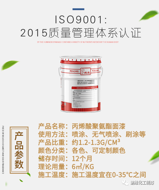 组成:由耐候丙烯酸树脂,耐候性的颜料,助剂,有机溶剂等为甲组份;脂肪族聚氨酯固化剂为乙组份。